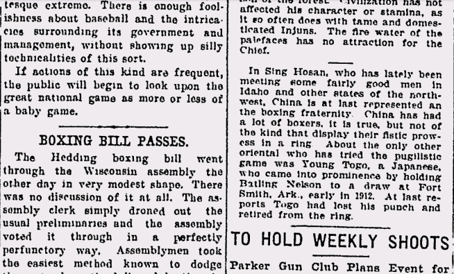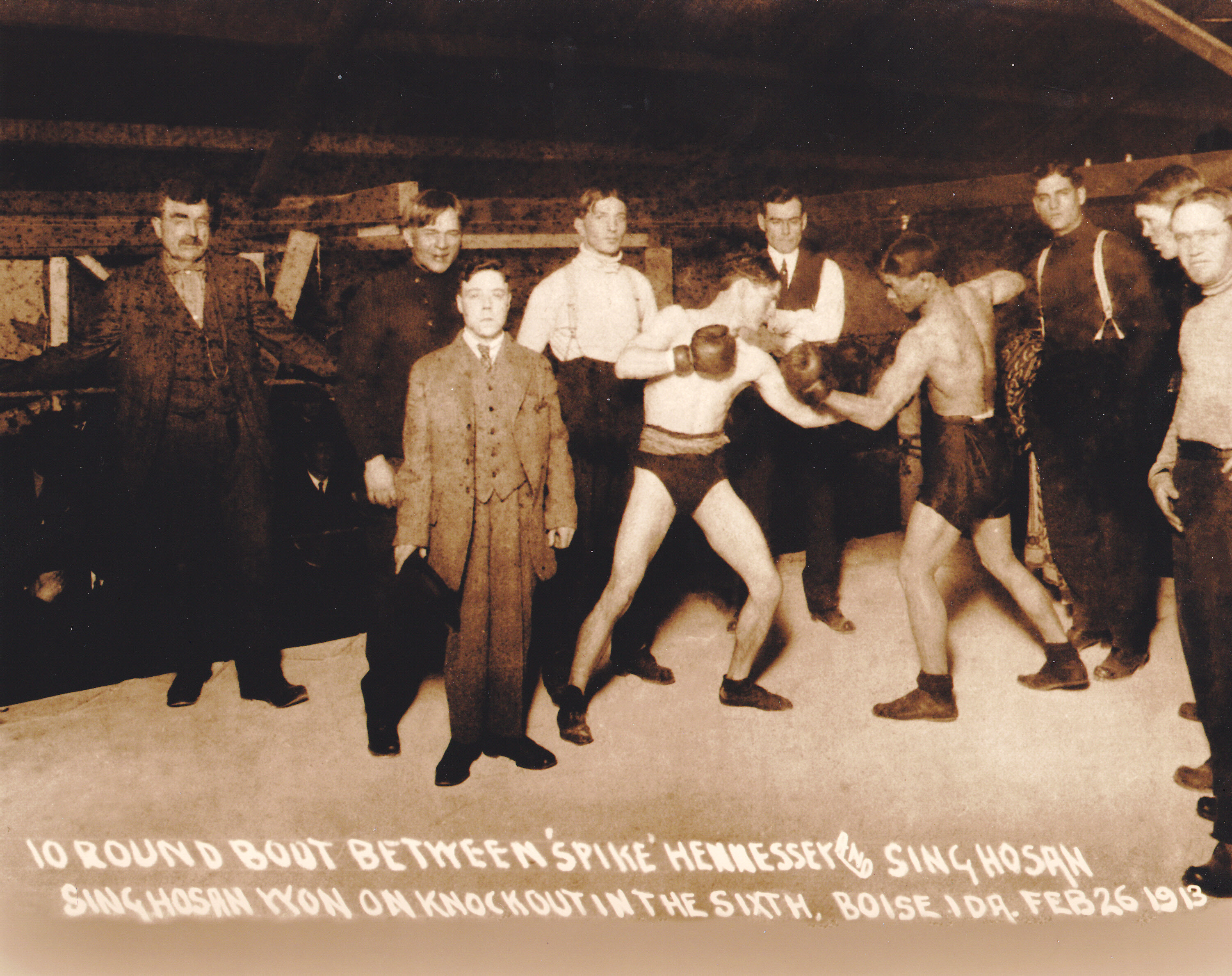 By the early 20th century some of the Chinese-American fighters were ready to turn pro. One such individual was Sing Hosan, pictured above. Sing Hosan was born in the closing years of the 19th century in a mining camp in Hailey Idaho. He had a number of professional fights and his picture was in the newspaper a couple of times. Unfortunately I have never been able to figure out what his ultimate professional record was or when he hung up his gloves. His fight with the Irishman “Spike” Hennessey ended when the heavier and stronger Sing knocked his opponent out in the sixth round.