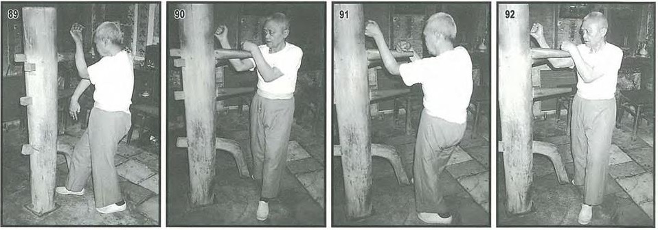 The preceding series of pictures, taken by Leung Ting and published in his book Roots and Branches of Wing Tsun, show Hak Min Nam (often called by his nickname Pan Nam, b. 1911- d. 1996) working a Dai Jong that has planted in his study.  This is a good real life example of the sort of indoor dummy which Donny Yen is seen working in the first Ip Man movie.  Master Kwok Fu, one of Ip Man’s original Foshan students, planted his dummy outdoors (presumably sometime after the Cultural Revolution) and was still teaching students on it in the 1990s.