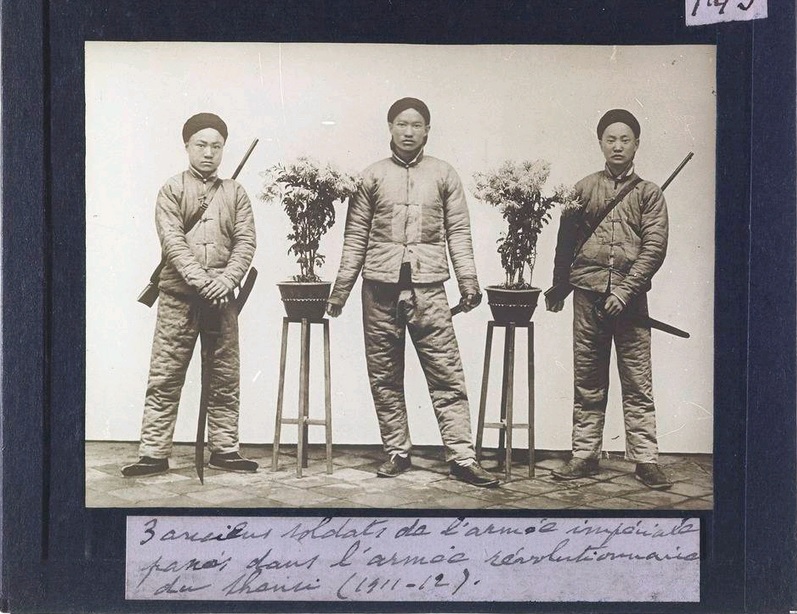 Most of the images in the de Maynard collection focus on more contemporary scenes. One of my favorites is of three soldiers in quilted uniforms posing with carbines and swords. The image was probably taken some time in 1911. The label indicates that the three individuals were former members of the Imperial military who had switched sides, and now fought with a revolutionary army. It is hard to tell what sort of carbines they are carrying. My best guess is that they are probably black powder rifles (either p53s or Sniders) that have been cut down. Each of the soldiers also carries a serious looking sword.