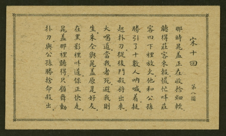 Literary references to hand combat were quite common. In fact, it appears that this was the primary medium by which most people were exposed to images or ideas from the martial arts. One popular tactic with advertisers was to include serialized wuxia stories on the cigarette cards. These would be illustrated with images of action on one side, and short passages on the other. It appears that classic stories and novels were popular in these settings, likely because the consumers were already familiar with the plot and identified with the characters.