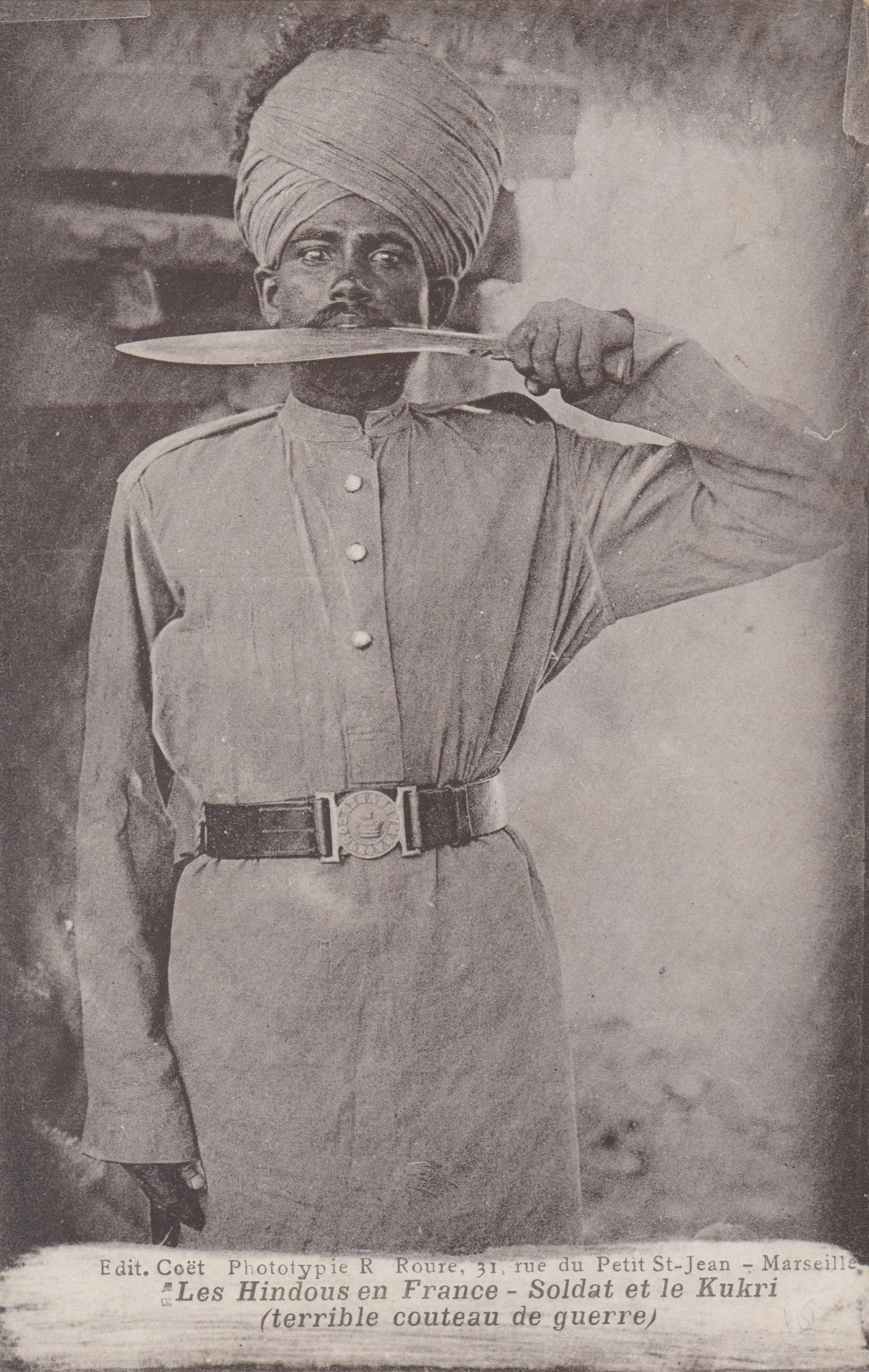 French postcard sold in Marseille (circa 1915) showing a “Hindu” member of the Indian Army Bearer Corp (note the belt buckle) holding a kukri. Source: Author’s personal collection.