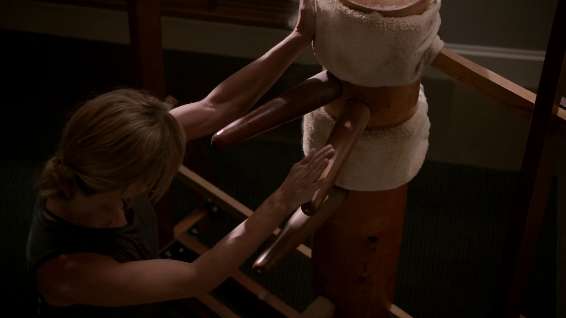 Somewhere along the line wooden dummies became something that the general population equated with being a bad-ass in martial arts. i.e. If you train on a dummy then you can really destroy your foes in devastating fashion. You see dummies everywhere now. We sold some dummy pads to ABC’s Revenge (in Episode 8 of season 4 you can see them used when the heroine is hitting on a dummy). Although the intent is comical, in the Mr. Bean Snickers commercial he is playing on a dummy. The other day I saw a dummy in the training gym on the TV show Nikita or something like that. You just see them everywhere now. It is like “the thing” to have in the background when martial-arts training is happening on-screen.