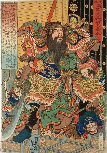 In so doing he explicitly identifies the weapon as that wielded by the hero Guan Yu in the classic novel The Romance of the Three Kingdoms. The same story was very popular in Japan (where it often went by the title Sangokushi). In fact, this one work has spawned literally countless derivative novels, stories, plays, woodblock prints, poems, manga and movies between the late Tokugawa period and today. It has occupied an important place within Japanese popular culture for literally centuries.