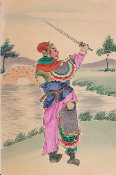 The postcard at the top of this post is a collage constructed from various bits brightly painted and inked paper. The warrior’s body, face and hands all seem to be made of separate applications. The blade of his jian, however, is inked directly onto the card. The white sections on the back of his armor and leg are areas where the bare card stock has been allowed to show through.