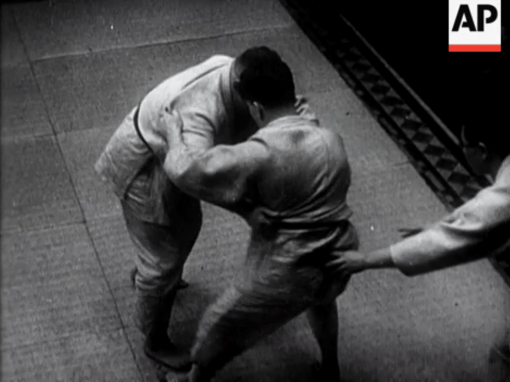 A Judo match between a British and German competitors. Taken from a vintage newsreel. 1932.