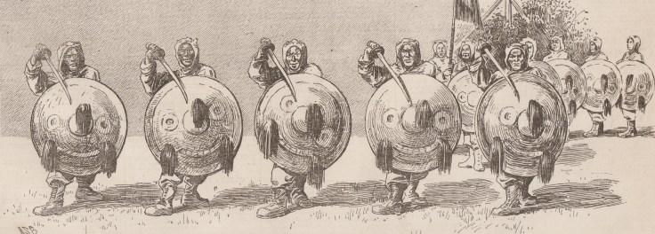On arrival at the exhibition building the procession marched down the nave, to the accompaniment of their band, and in the presence of a large concourse of people presented his Excellency the Governor, who was present, with a draft address.  His Excellency having replied the procession disbanded, and during the afternoon took part in a series of performances, one of which, a single combat, has been selected for illustration.  The combatants displayed great activity in avoiding the repeated thrusts made by each, but the fighting was not very scientific, the object of both duelist seeming to be to plant his feet in the pit of the stomach of the other after the style of the Mexican pugs, and after having incapacitated him from resistance to dispatch him with a knife.