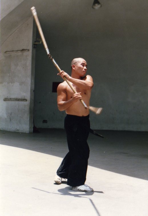 Eventually, even though the number of the local students dropped, Xiao Peng’s group in the park grew and ultimately had more foreigners than Taiwanese. He started to make a name out of Taiwan. First, he was invited to perform at the “Masters Demo” in the Wong Tat-Mau international tournament in California. I competed in this event in 1991, and I considered it a great honor. I was told his demonstration of praying mantis and three-sectional staff was well accepted. A few years later he was invited to the Bercy martial arts festival in Paris, where he demonstrated praying mantis, drunken fist, and the chain whip. Both flexible weapons in those demos were taught to Xiao Peng by his teacher, Zhang Yingchun (張迎春).