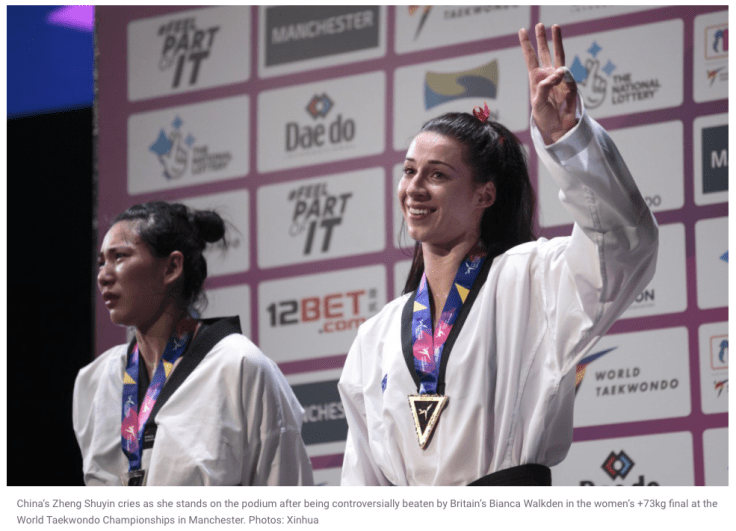 Our next article touches on a number of themes that we have already introduced. Yet rather than discussing the “Chinese martial arts” it is more a story of one Chinese martial artist (Zheng Shuyin) and her controversial defeat by Biaca Walkden (UK) at the recent Taekwondo World Championship. Walden, who was trailing in the match forced Zheng to step out of bounds multiple times. Given the number of fouls she (Zheng) was already carrying, this led to her being disqualified and Walkden being handed the victory, much to the displeasure of the crowd watching the match and Chinese TKD officials everywhere.