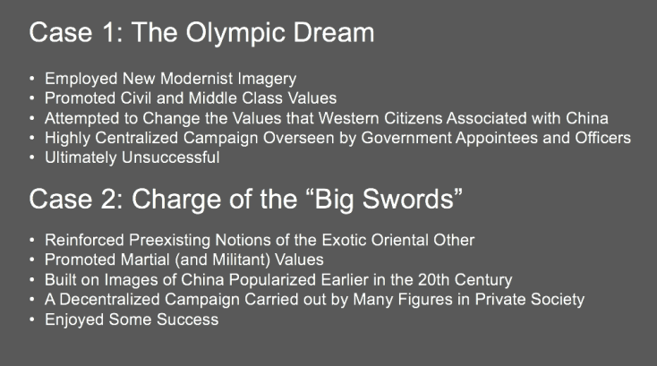For my concluding point I would like to return to our first case, that of Chu’s Olympic efforts, and ask what it suggests about the promise and limitations of cultural diplomacy in the current era. What lessons might current states learn from these early efforts? And what do they suggest about the ability of smaller states to build a distinctive brand on the world stage through public or cultural diplomacy.