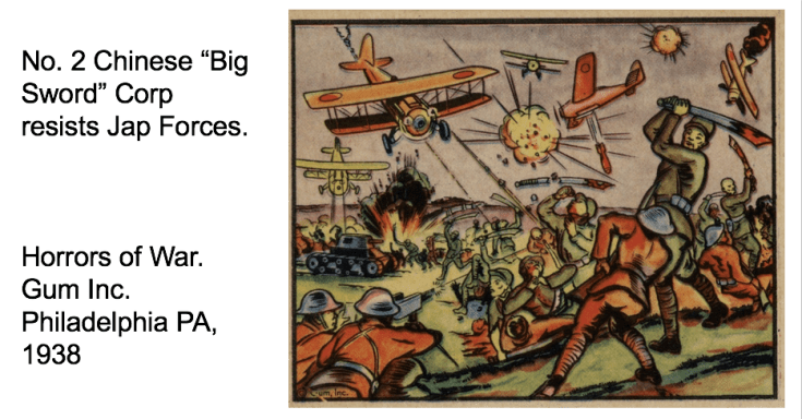 One of its most popular images (No. 2) was titled “Chinese Big Sword Troops Resists Jap Forces.” The front of the card showed a pitch battle in which Chinese troops, wielding their signature dadaos, overran a Japanese machine gun nest while being strafed from the air. At a time when the mood of the country was largely isolationist, the back of the card sought to inform American children about the role of “Big Sword Troops” in the battles around Beijing.