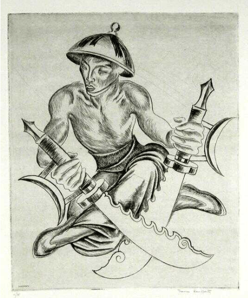 This strain of romanticism was very much alive in the 1930s. As the KMT linked the development of the martial arts to the promotion of Chinese nationalism, elements of the primordialist discourse surrounding the TCMA were strengthened. All of that is evident in Handforth’s art. Note for instance the swordsman wearing what appears to be a traditional Qing era bamboo helmet. And yet the dadao that he manipulates were quite a popular weapon during the 1930s. When looking at the heroic, art-deco inspired, treatment of the human form, it is clear that Handforth’s work captured the spirit of the age.