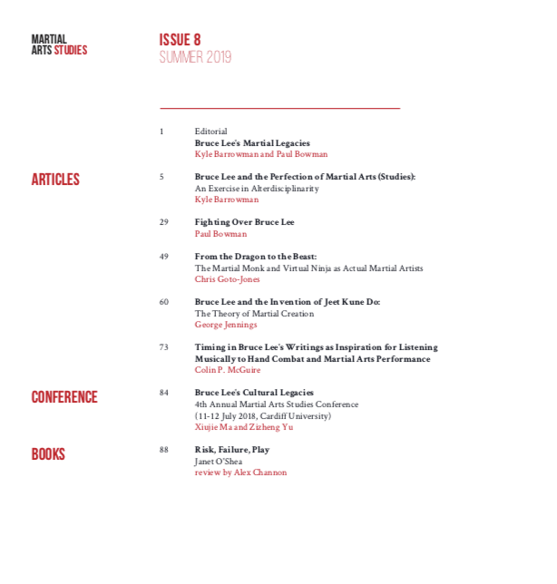We are thrilled to announce the release of the Summer 2019 issue of Martial Arts Studies (Number 8). This special issue has been guest edited by Kyle Barrowman and Paul Bowman. It collects in a single place a number of important conference papers and other works seeking to explore the ongoing and multi-faceted legacies of Bruce Lee within the martial arts today. From his film career, to a critical engagement with the notion of the “classical mess,” to taking a deep dive into his classic article “Liberate Yourself from Classical Karate”, there is a little something here for everyone. Students of Martial Arts Studies will want to begin with the debate between Barrowman and Bowman over what Bruce Lee reveals about the current theoretical orientation of the field. Sociologists and social scientists, on the other hand, may want to check out George Jennings engagement with the creation of Jeet June Do in which he proposes a general theory for the creation of new martial arts systems. And that is just the start of the discussion.