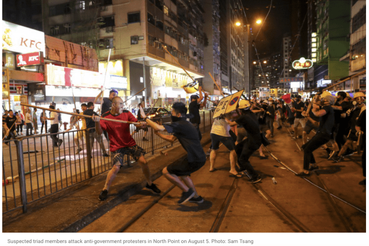 Given this blog’s emphasis on the Southern Chinese martial arts (and Wing Chun in particular), I know that many readers are following the unfolding civil unrest in Hong Kong closely. While the US media covered the initial burst of protest following the proposal of the now withdrawn extradition law, the topic quickly faded from the headlines for much of the summer, only to reappear with the escalation in the conflict between the police and pro-democracy demonstrators in the last week or so. More troubling has been the occurrence of new rounds of violence between the demonstrators and gangs of similarly dressed men, often armed with poles or sticks.
