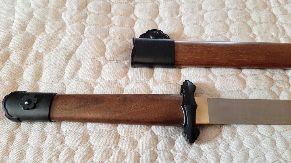 All of which bring us to the review of LK Chen’s Heng Dao. This is a reproduction of the type of sword that would have been carried by a common soldier or junior officer. As such, its fittings are rendered in cast iron which has been painted black (a historic technique) even though they are modeled off of a surviving set of silver fittings. The simple ironwood scabbard is sleek and nicely constructed but lacking the ornamentation of many of the more fanciful Longquan “Tang Dao.” The overall visual effect is one of almost “Danish modern” elegance, though the weapon remains a historic recreation.