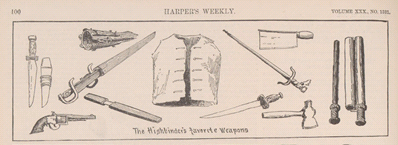 Readers should carefully examine the banner of the engraving on page 100. It contains a surprisingly detailed study of weapons confiscated from various criminals and enforcers. As one would expect, handguns and knives play a leading role in this arsenal. The stereotypical hatchet and cleaver are also present.