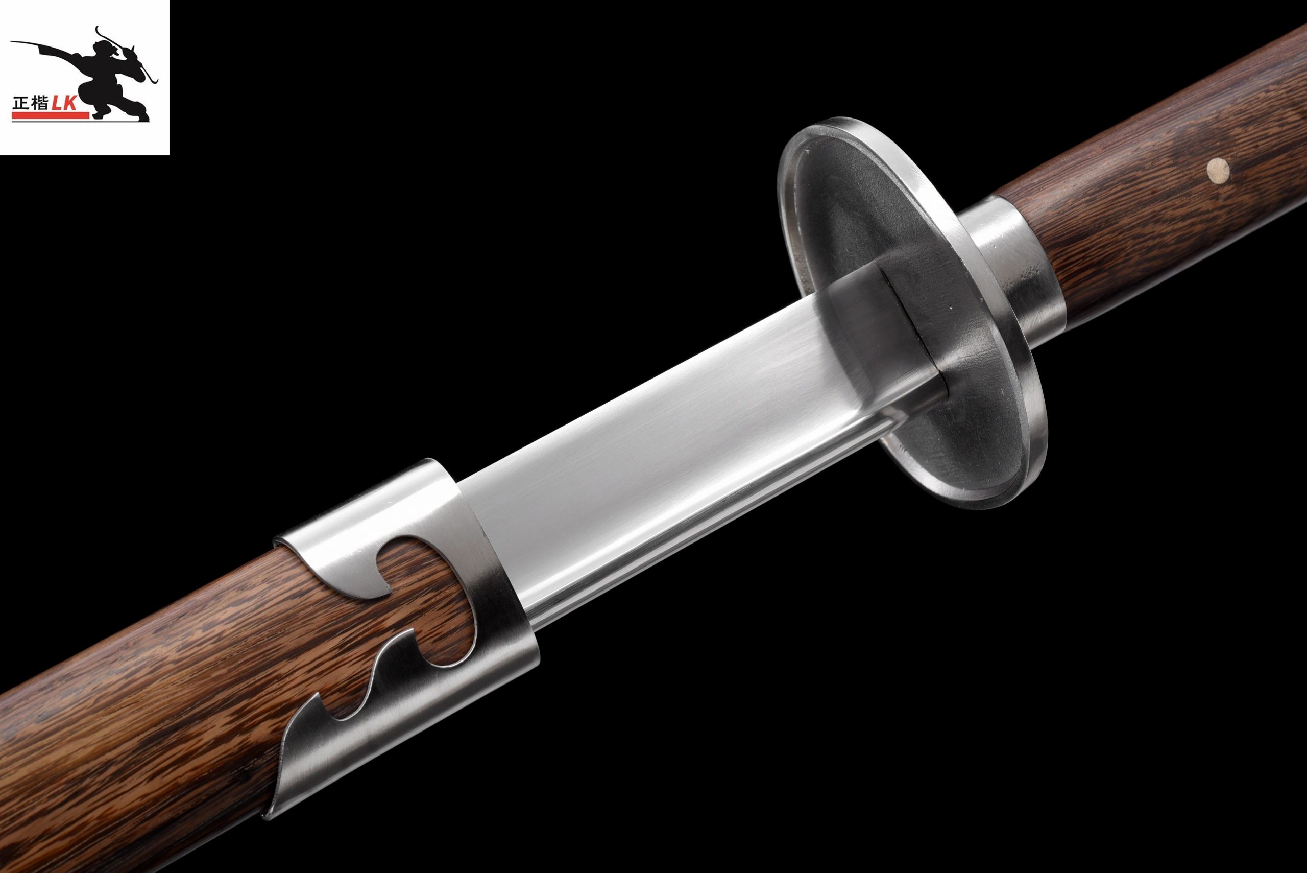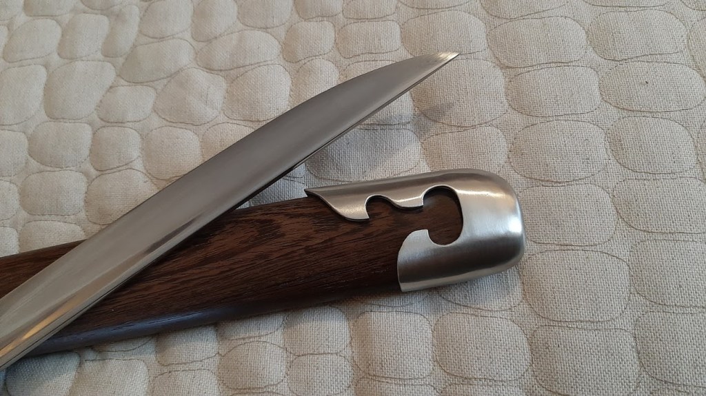 All of which brings us to LK Chen’s Silver Swallow, an image clearly meant to evoke Guo Changshen’s nickname. He was sometimes called “the Swallow” due to the elegance and speed of his blade work when fencing. While visually similar to many other miaodao coming out of Longquan (most of which were influenced by the innovations of the Guo family) there are also a number of significant differences. As always, the quality of blade itself is higher on LK Chen’s creations than what is typically seen on Longquan export products. We can also see some subtle difference in the way that these blades are mounted. While most production swords have relatively inexpensive brass fittings, LK Chen’s features sleek stainless-steel furniture. But the most obvious difference will be size.