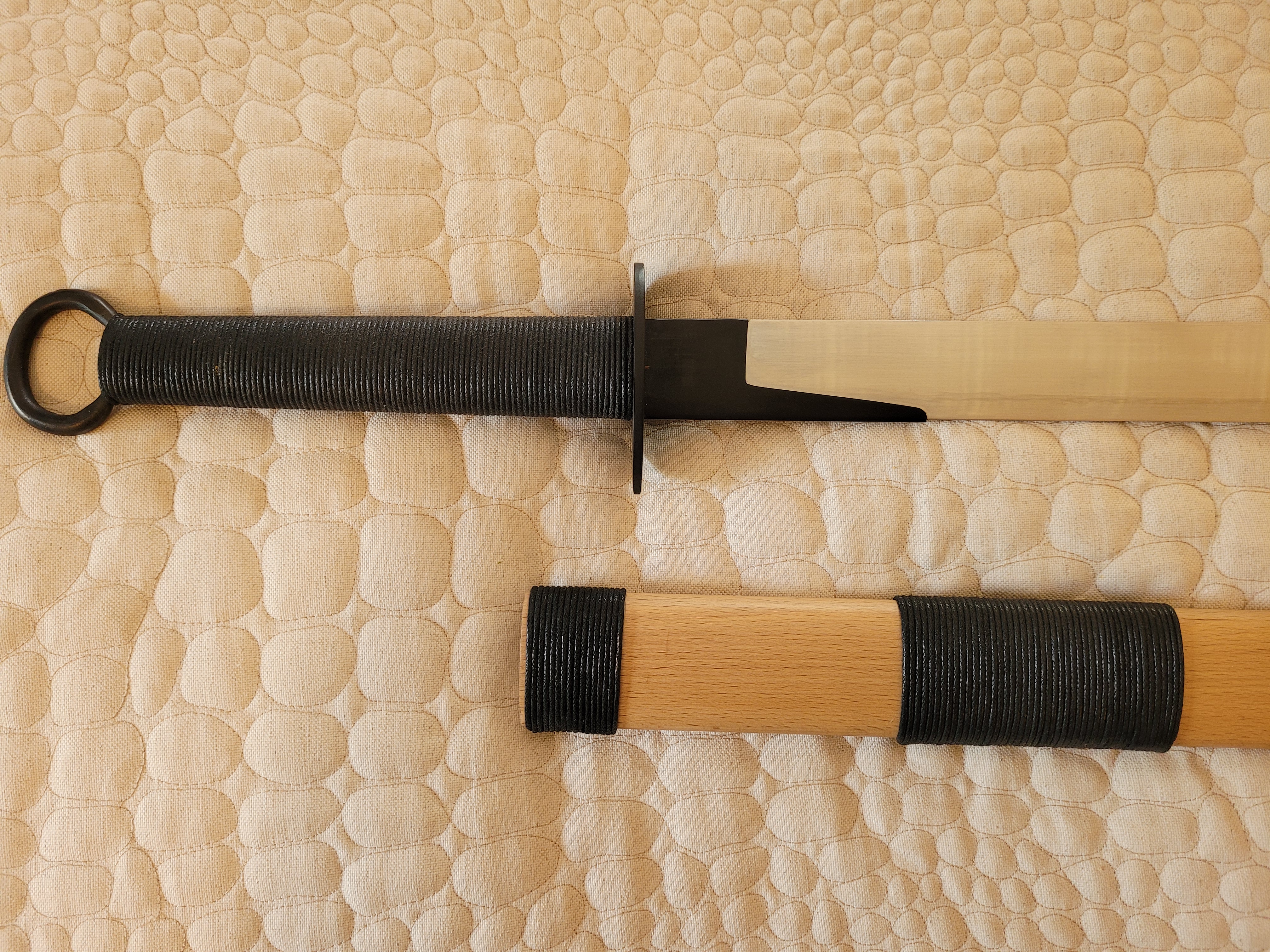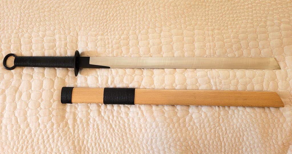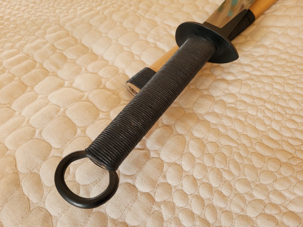 Compared to some of his other offerings, the Hand Dao’s scabbard is minimalist. It is constructed from a light-colored wood with black cord wrappings that mirror those used on the hilt. Everything on my scabbard has stayed tight and true and there are no issues with its construction. The final package is a sort of minimalist “Danish Modern meets Kung Fu.” To the best of my knowledge, there are no surviving scabbards from Song ring pommel Dao (which is a bit odd considering how many blades survived), so in this case we are on our own.