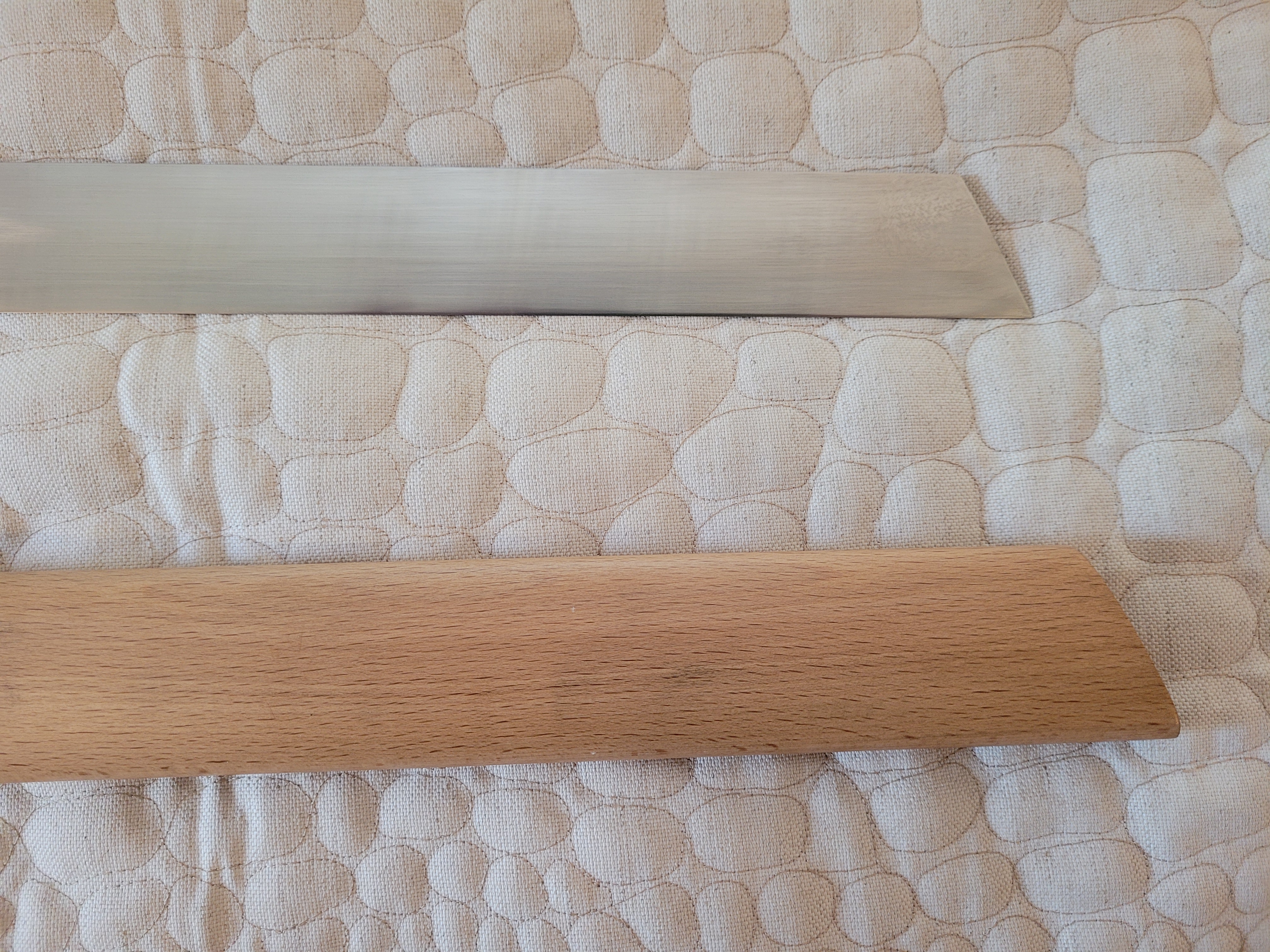 The blade itself is well constructed. The spine and cutting edge are perfectly straight. The blade at first appears to have a “V” shaped edge profile but closer examination reveals that the angle of the edge bevel increases about halfway down the side of the blade yielding a very keen edge that is still supported by a relatively heavy spine. The blade was polished to a nice, but not quite mirror, finish. The hamon was actually more interesting than I expected, showing some interesting movement in places. Unfortunately, I have been unable to get any photos that really do it justice. A few very shallow hammer strikes were still evident on the flat of the blade confirming that this was indeed a hand-made piece.