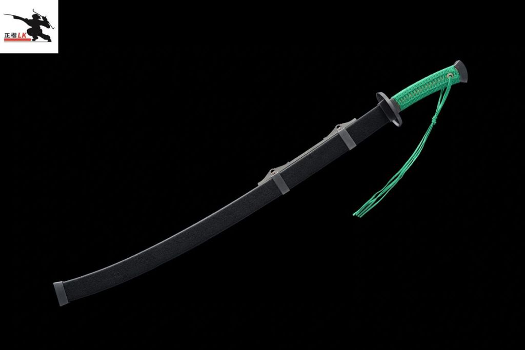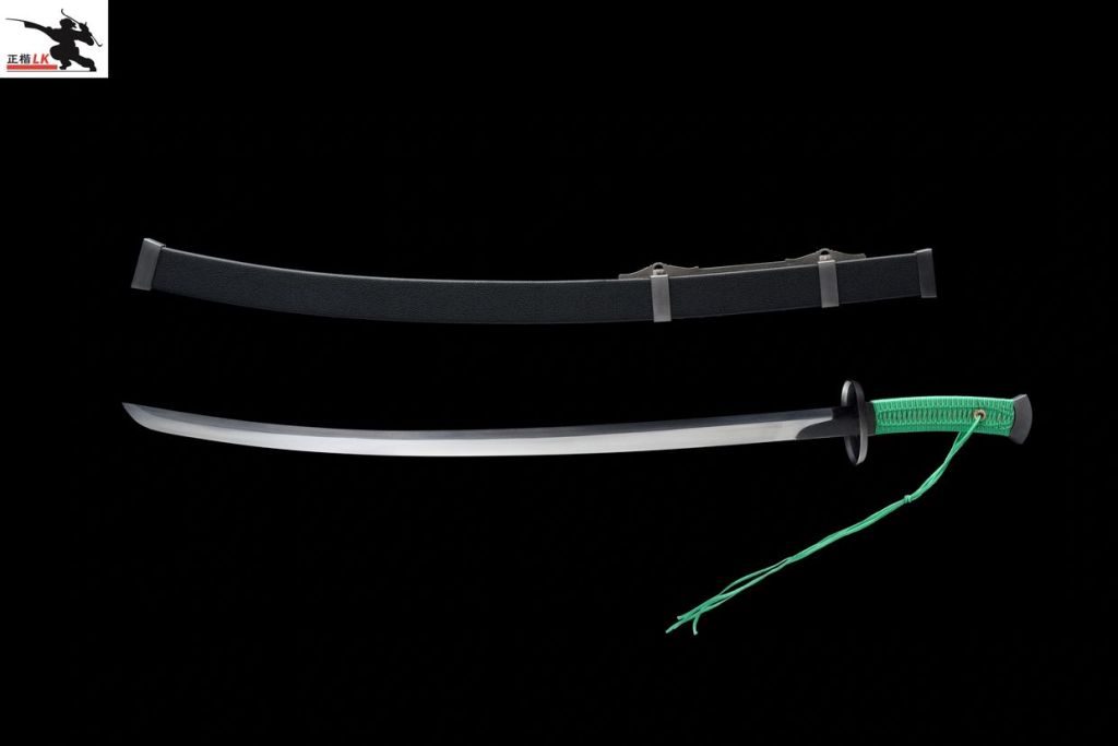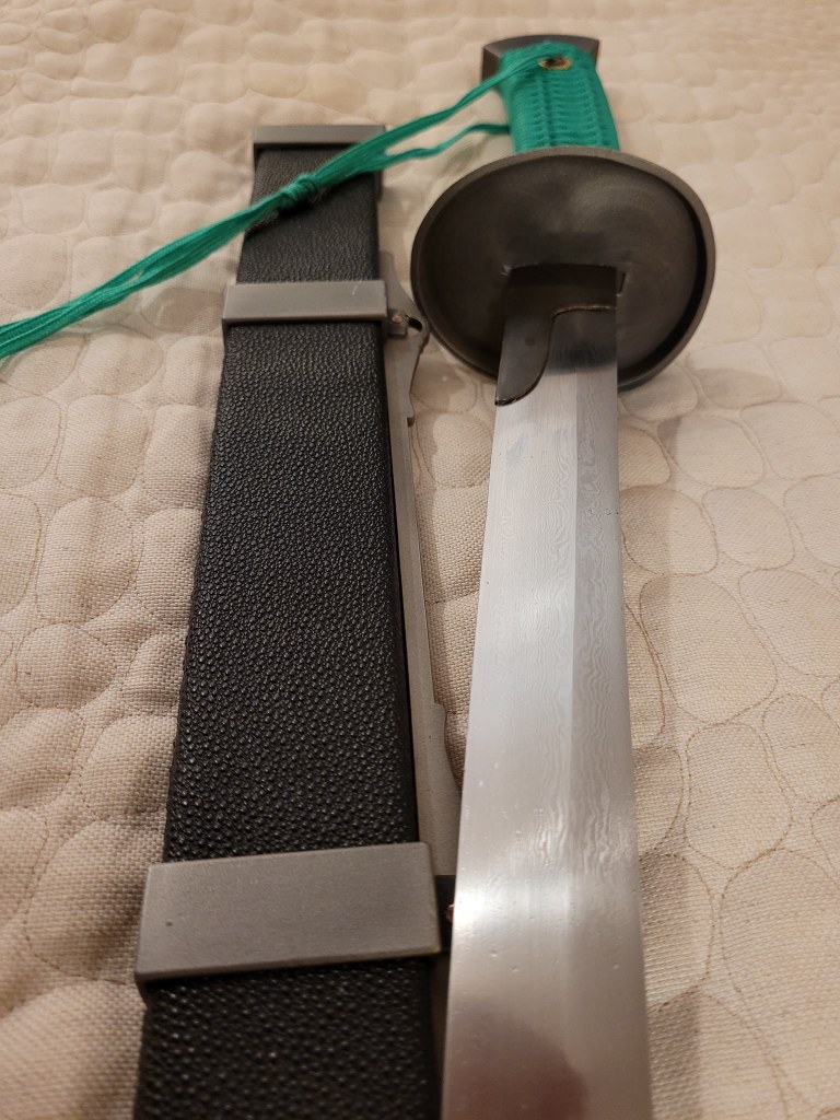 The sword’s scabbard is very nicely executed. The black “vegan leather” is a historically appropriate choice and compliments the vivid green hilt. The cast steel fittings are heavy and with good attention to detail. The sword itself fits tightly in the sheath and will not easily fall out. Yet there is some play toward the tip. The cup shaped handguard is substantial with a flattened oval profile. Overall, LK Chen’s fittings take their design cues from those created by Tom and Evans without being direct copies of them. As beautiful as the more detailed reproduction fittings on the Yanling Dao are, I think I personally prefer the elegant simplicity, and comfort, of those on the Woyao Dao.
